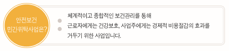 50인 미만 소규모사업장을 대상으로 근로자 건강보호 및 자율보건관리 정착에 기여하기 위하여 산업보건 전문기관을 통해 사업장에서 자체적으로 하기 어려운 보건관리를 국고에서 지원하는 사업입니다.
